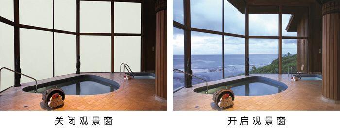 當(dāng)調(diào)光玻璃關(guān)閉電源時(shí),電控調(diào)光玻璃里面的液晶分子會呈現(xiàn)不規(guī)則的散布狀態(tài),此時(shí)電控玻璃呈現(xiàn)透光而不透明的外觀狀態(tài);當(dāng)給調(diào)光玻璃通電后,里面的液晶分子呈現(xiàn)整齊排列,光線可以自由穿透,此時(shí)調(diào)光玻璃瞬間呈現(xiàn)透明狀態(tài)。